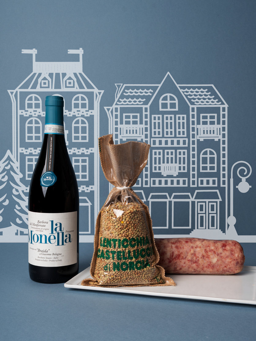 Barbera del Monferrato Frizzante DOC “La Monella” – Braida, 75 cl Lenticchie di Castelluccio, 500 g Cotechino Fresco, 1 kg circa
